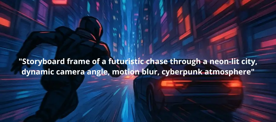 | Ação intensa | “Storyboard frame of a futuristic chase through a neon-lit city, dynamic camera angle, motion blur, cyberpunk atmosphere” | Excelente para filmes de ação e ficção científica. |