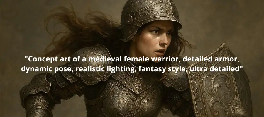 | Concept art de personagem | “Concept art of a medieval female warrior, detailed armor, dynamic pose, realistic lighting, fantasy style, ultra detailed” | Pode ser usado para definir figurino e postura do personagem. |