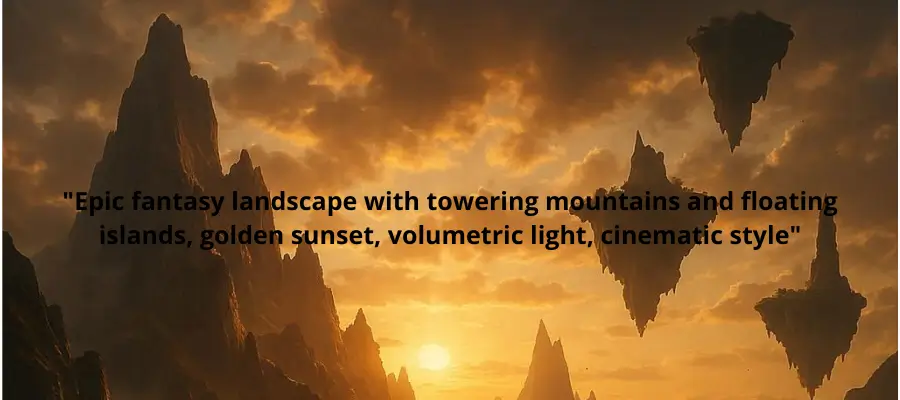 | Concept art de cenário | “Epic fantasy landscape with towering mountains and floating islands, golden sunset, volumetric light, cinematic style” | Ótimo para estabelecer clima e escala do ambiente. |