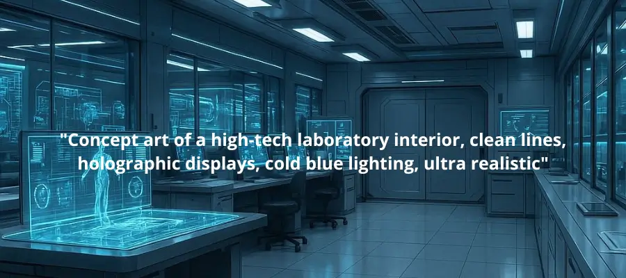 | Ambiente futurista | “Concept art of a high-tech laboratory interior, clean lines, holographic displays, cold blue lighting, ultra realistic” | Usado para cenários de sci-fi e thrillers tecnológicos. |